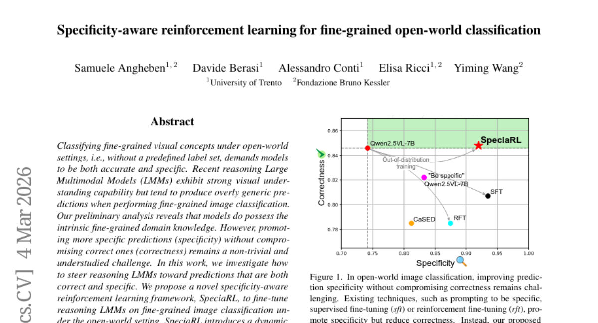 – The study proposes a reinforcement learning framework named SpeciaRL to enhance the specificity of large multimodal models in fine-grained image classification under open-world settings, without sacrificing prediction correctness.