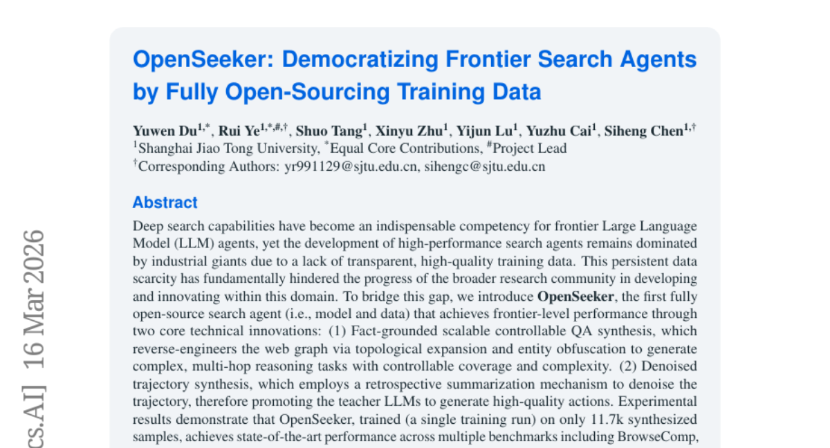 – To introduce OpenSeeker, the first fully open-source search agent, aiming to advance frontier-level performance in search capabilities for Large Language Model agents by overcoming the scarcity of high-quality training data.