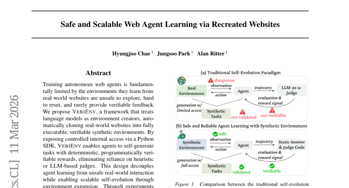 – VeriEnv enables agents to generalize learning to unseen websites, achieve mastery through self-evolving training, and benefit from scalable training environments, all while avoiding unsafe real-world interactions.