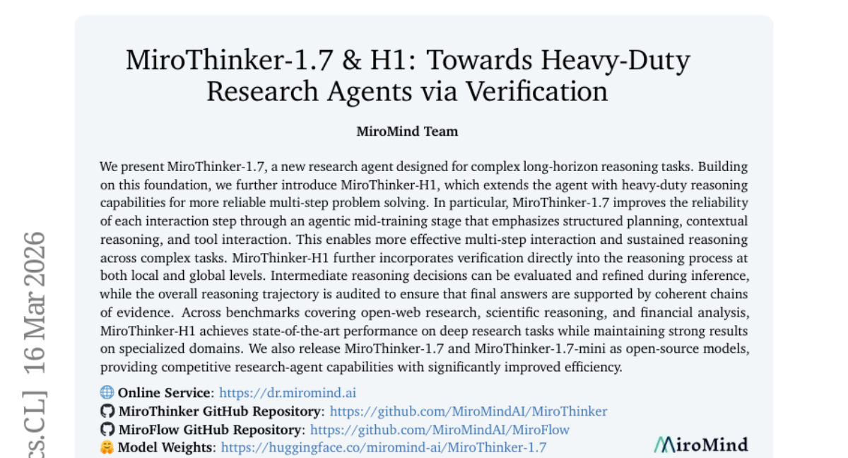 – To develop research agents MiroThinker-1.7 and MiroThinker-H1 aimed at enhancing complex reasoning through structured planning, contextual reasoning, and tool interaction.