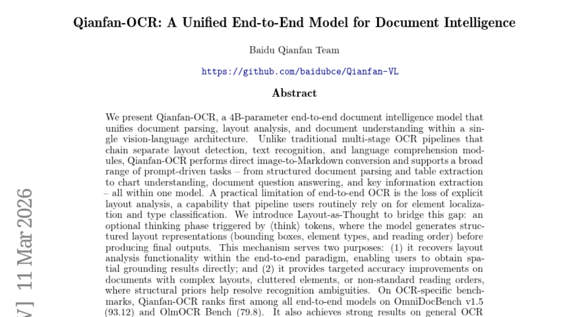 – The development of Qianfan-OCR, a 4B-parameter end-to-end vision-language model that unifies document parsing, layout analysis, and document understanding.