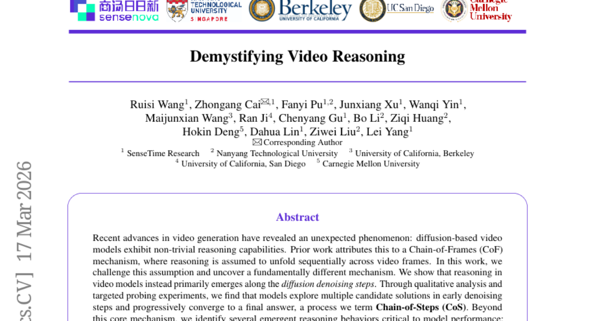 – The findings reveal that reasoning in video models primarily emerges along the diffusion denoising steps. The research identifies key reasoning behaviors such as working memory, self-correction, and perception before action. Additionally, it highlights functional specialization within Diffusion Transformers, contributing to better reasoning performance.