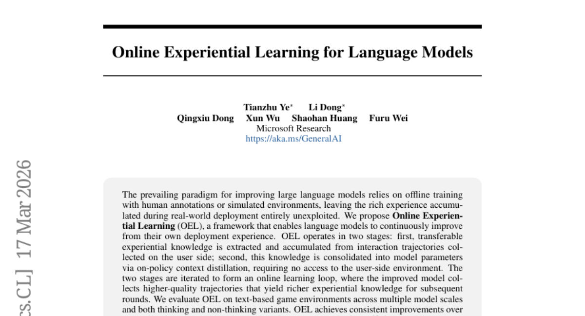 – The objective is to continuously improve large language models by leveraging deployment experience through a framework called Online Experiential Learning (OEL).