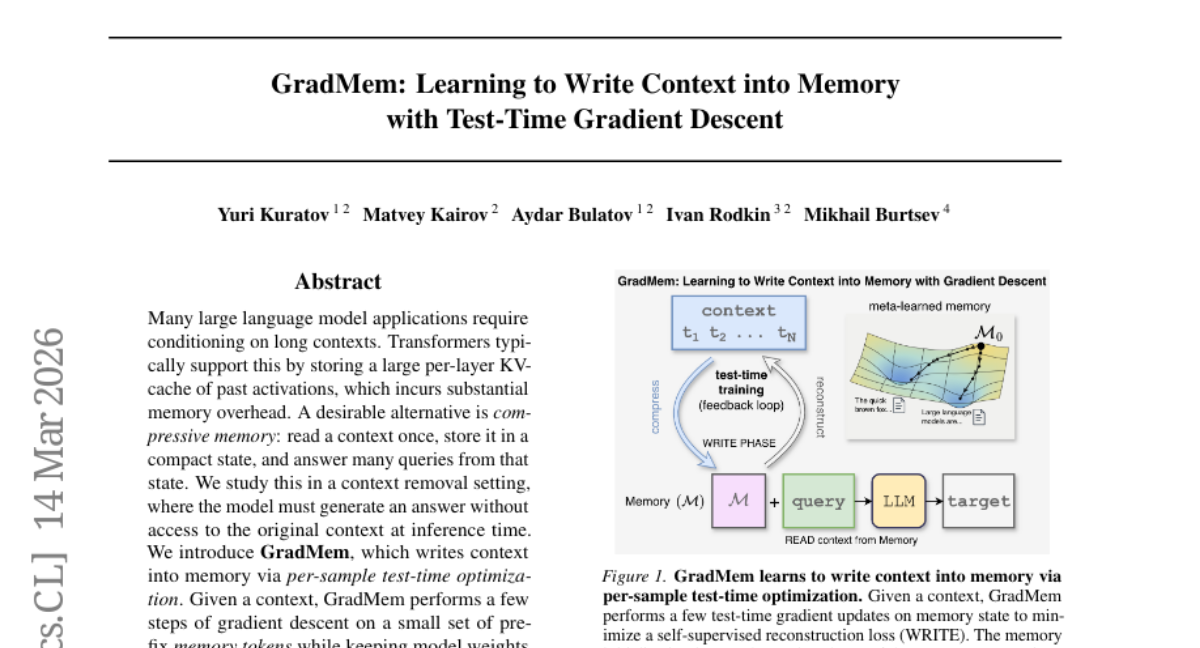 ๐Ÿ”‘ Keywords: GradMem, gradient descent, memory tokens, self-supervised context reconstruction loss