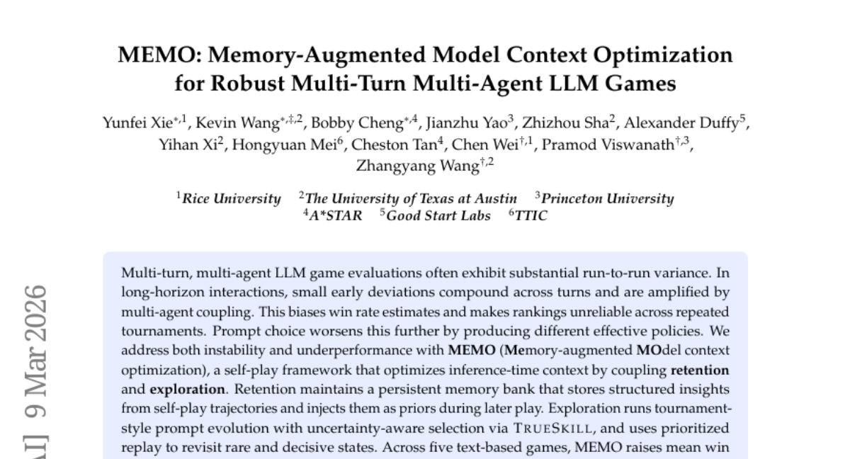 – To enhance the performance and stability of multi-agent large language model (LLM) games through a memory-augmented context optimization framework called MEMO.