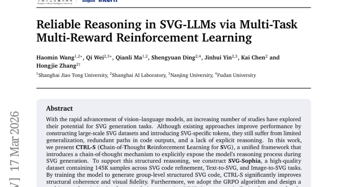 – The work aims to enhance SVG generation by using a chain-of-thought reasoning and multi-reward optimization to achieve better structural coherence and visual fidelity.