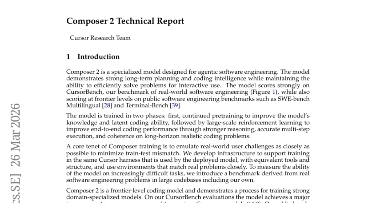 ๐Ÿ”‘ Keywords: Composer 2, agentic software engineering, continued pretraining, large-scale reinforcement learning, CursorBench