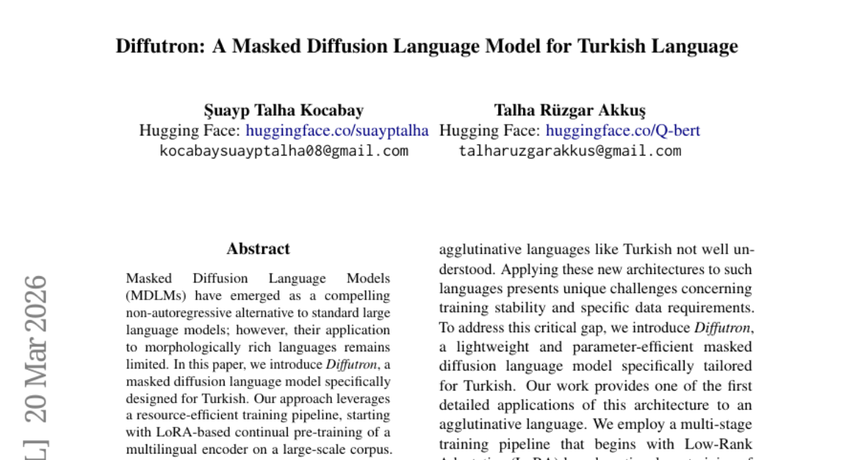 – To introduce Diffutron, a Masked Diffusion Language Model (MDLM) designed for Turkish, aiming for efficient non-autoregressive text generation.