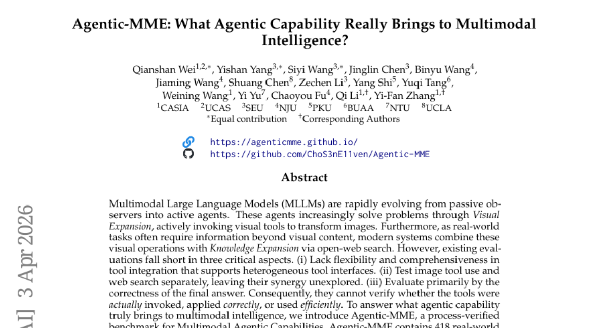 – Introduce Agentic-MME, a process-verified benchmark for evaluating Multimodal Agentic Capabilities by verifying tool usage and process efficiency, not just final answers.