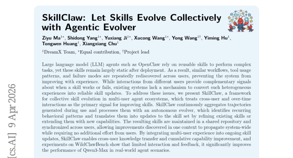 – Development of SkillClaw, a framework that aggregates user interactions and autonomously updates skills, recognizing behavioral patterns and refining or extending skills.