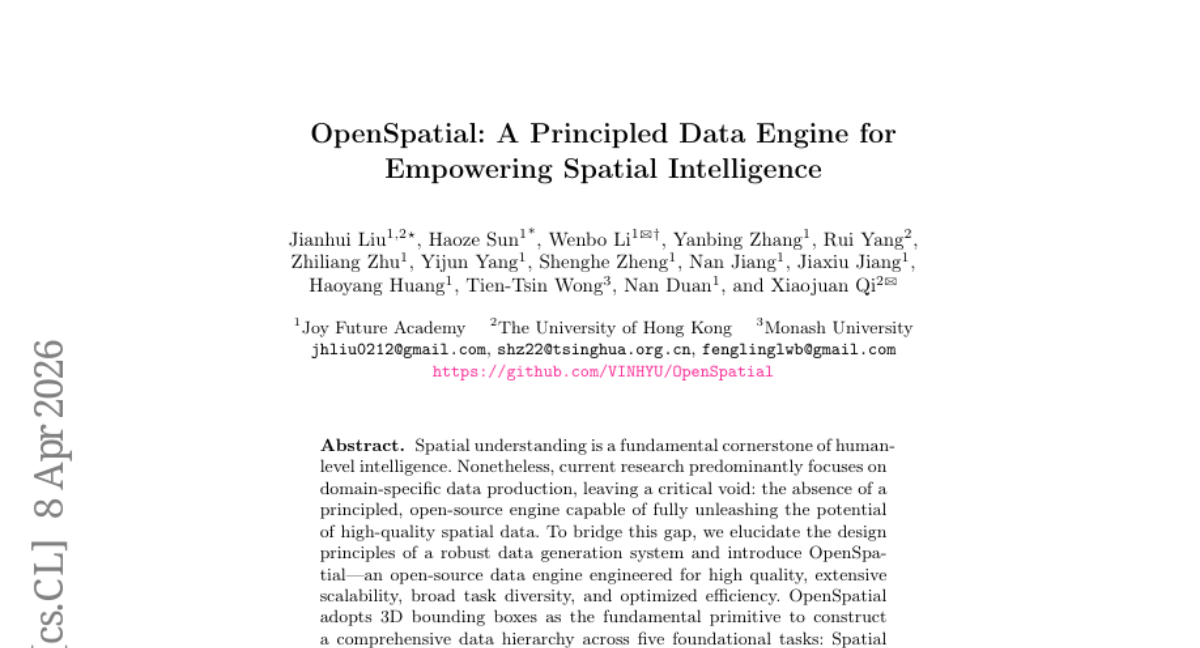 – The paper introduces OpenSpatial, an open-source data engine designed to enhance spatial reasoning tasks using 3D bounding boxes and to create a large-scale, high-fidelity dataset.