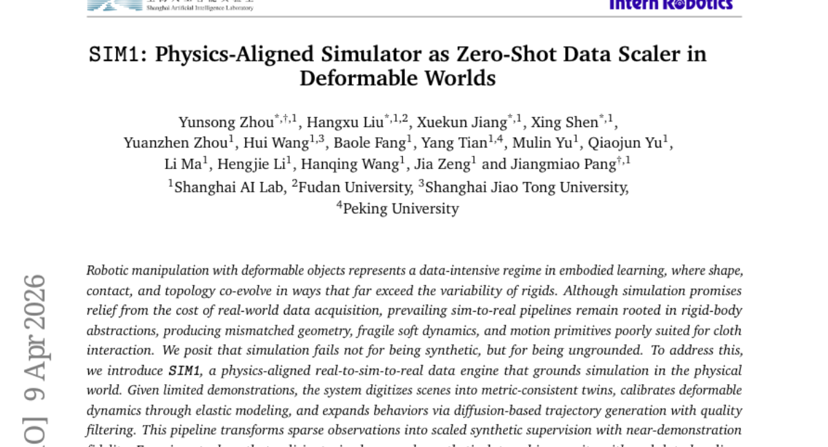 – Introduced SIM1, a real-to-sim-to-real data engine that digitizes scenes into metric-consistent twins, calibrates deformable dynamics via elastic modeling, and expands behaviors using diffusion-based trajectory generation with quality filtering.