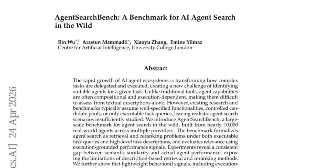 – The research introduces AgentSearchBench, a benchmark evaluating agent search as retrieval and reranking problems. It utilizes nearly 10,000 real-world agents from multiple providers, assessing relevance through execution-grounded performance signals.