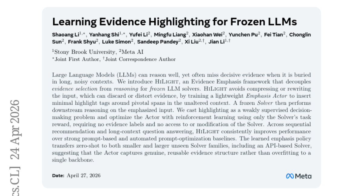 – The study aims to enhance long-context reasoning in frozen large language models by introducing HiLight, which focuses on decoupling evidence selection from reasoning.