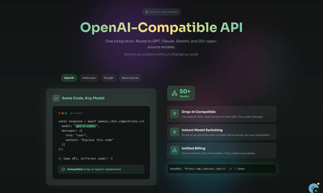 Instead of calling raw LLMs like GPT-5.1, developers can invoke purposeful models like `code-generator-model` or `secure-code-review`. AskCodi enables reasoning, auto-review, and secure output management at the model level, with support for open-source models and internal policies.